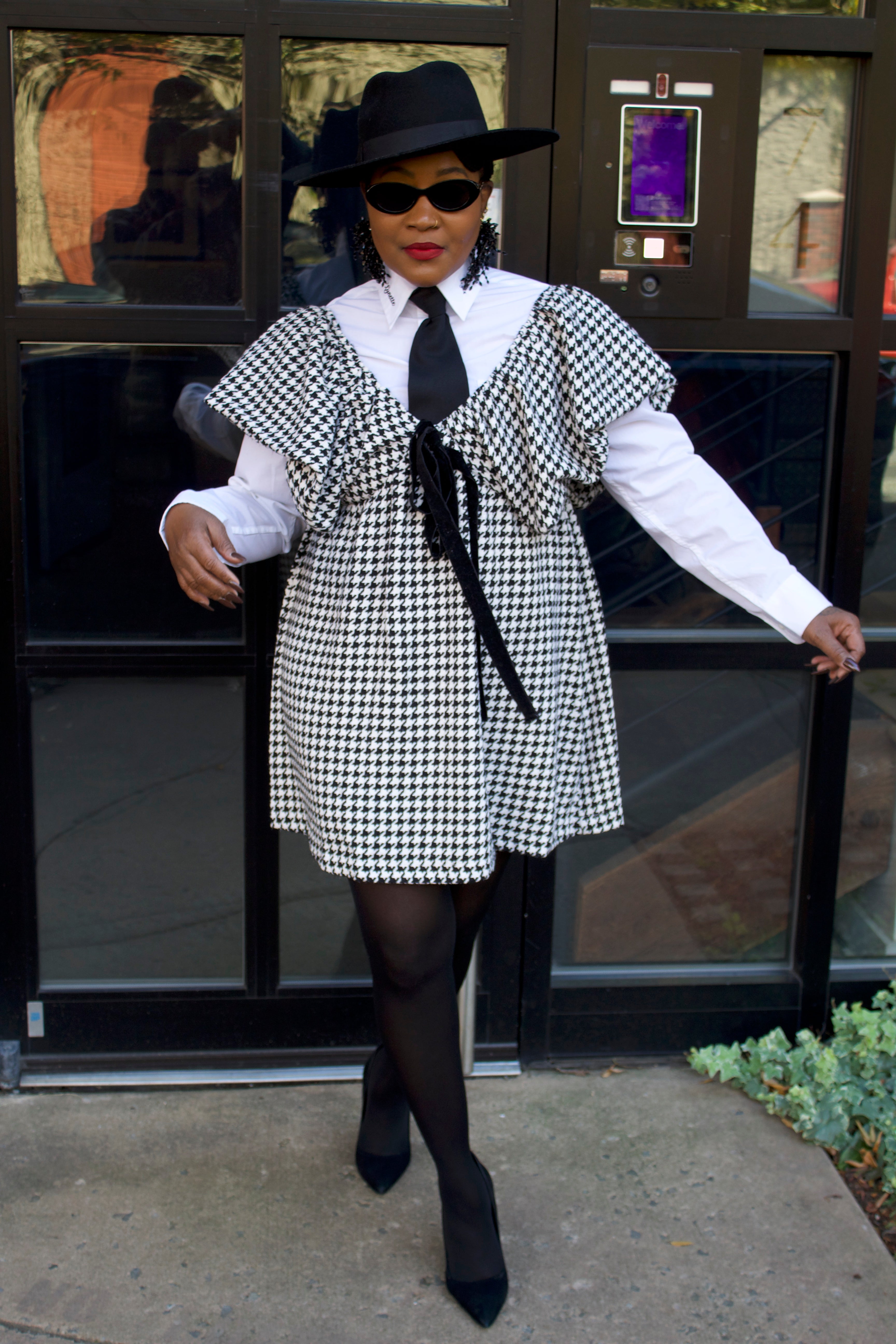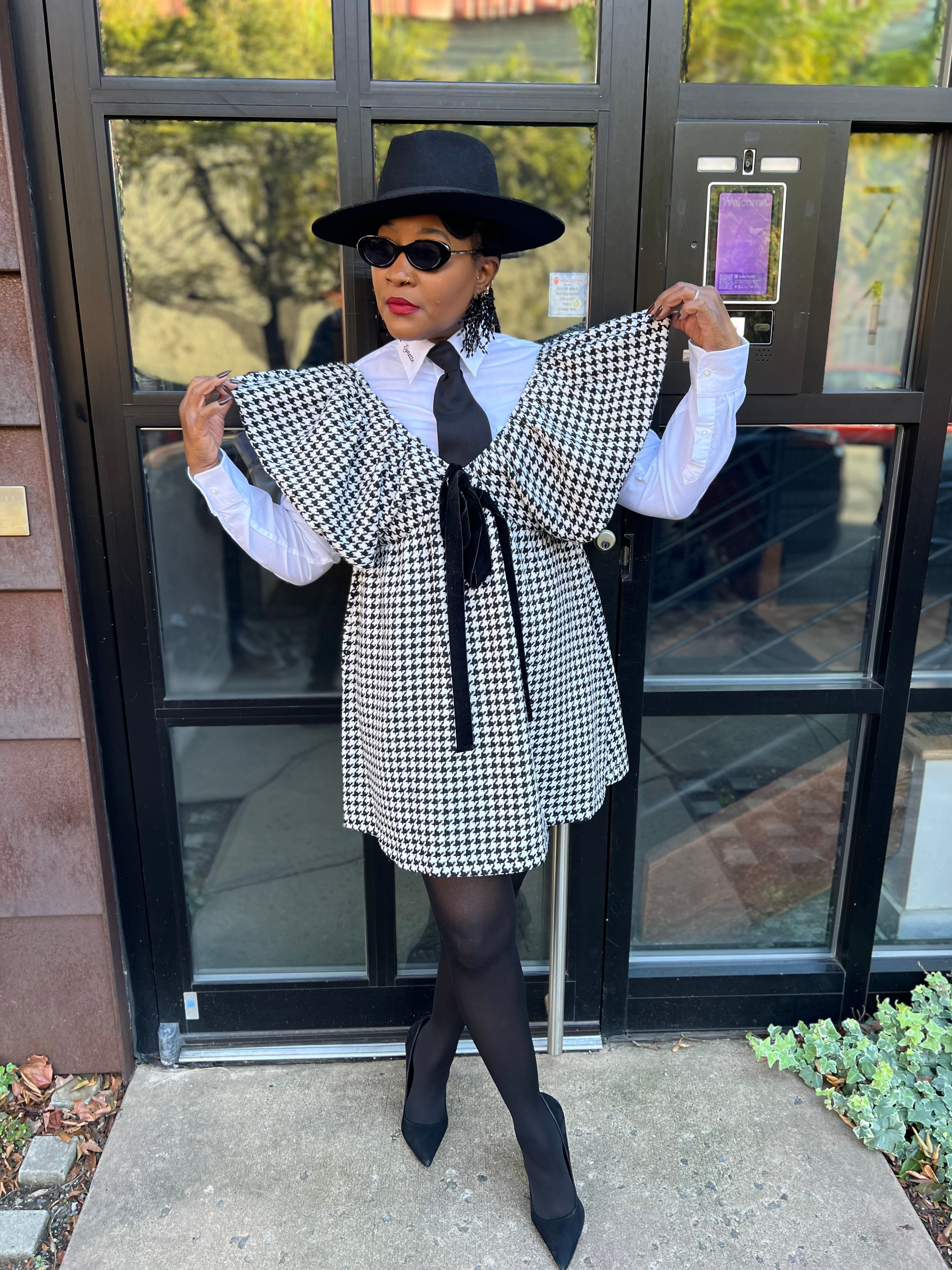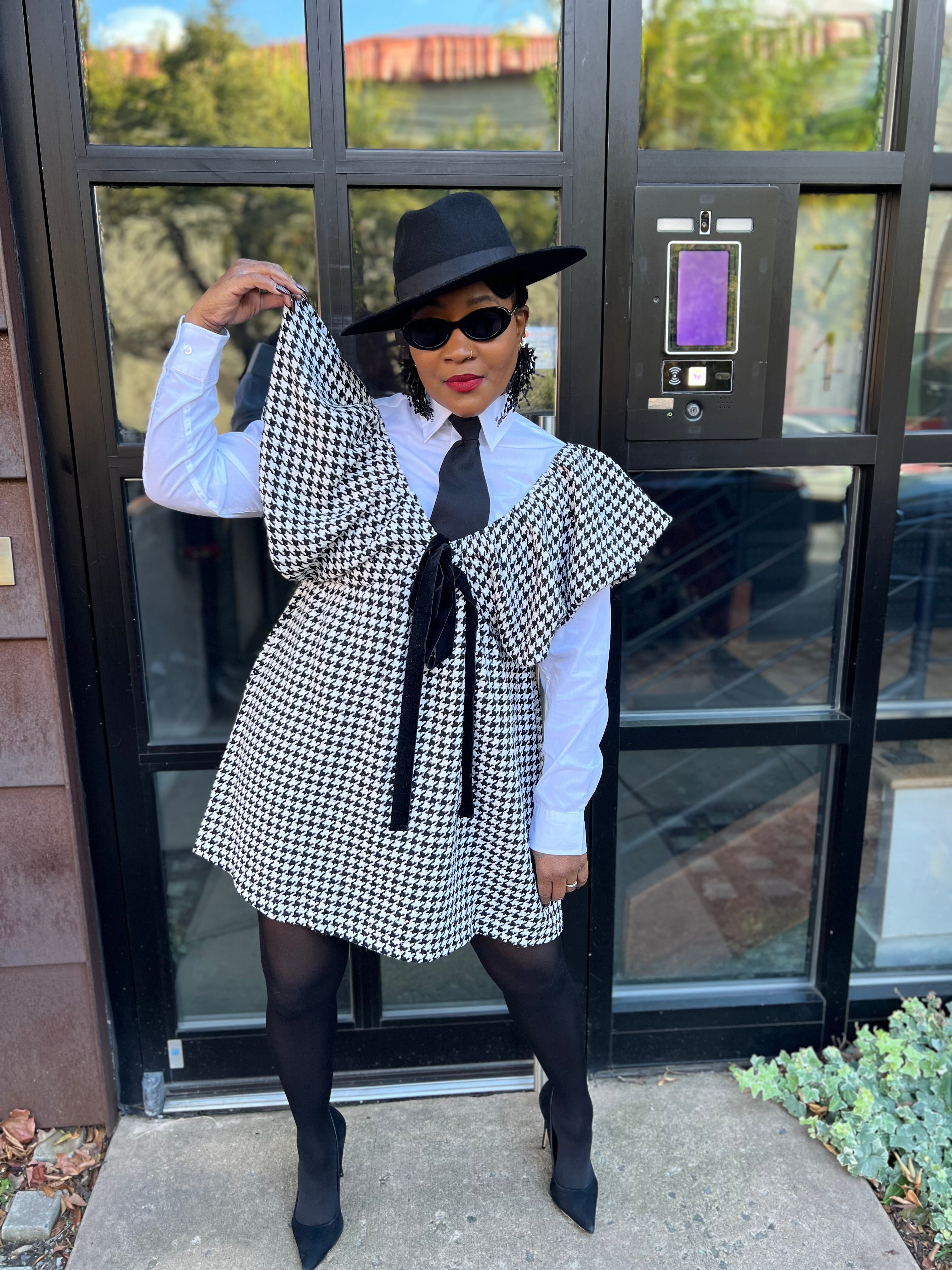 Classic houndstooth gets a modern remix. This baby doll silhouette features ruffled shoulders, a velour bow, and a luxe tweed-inspired texture that feels as good as it looks. Add tights and a collared shirt for the ultimate fall finish. Back zipper.