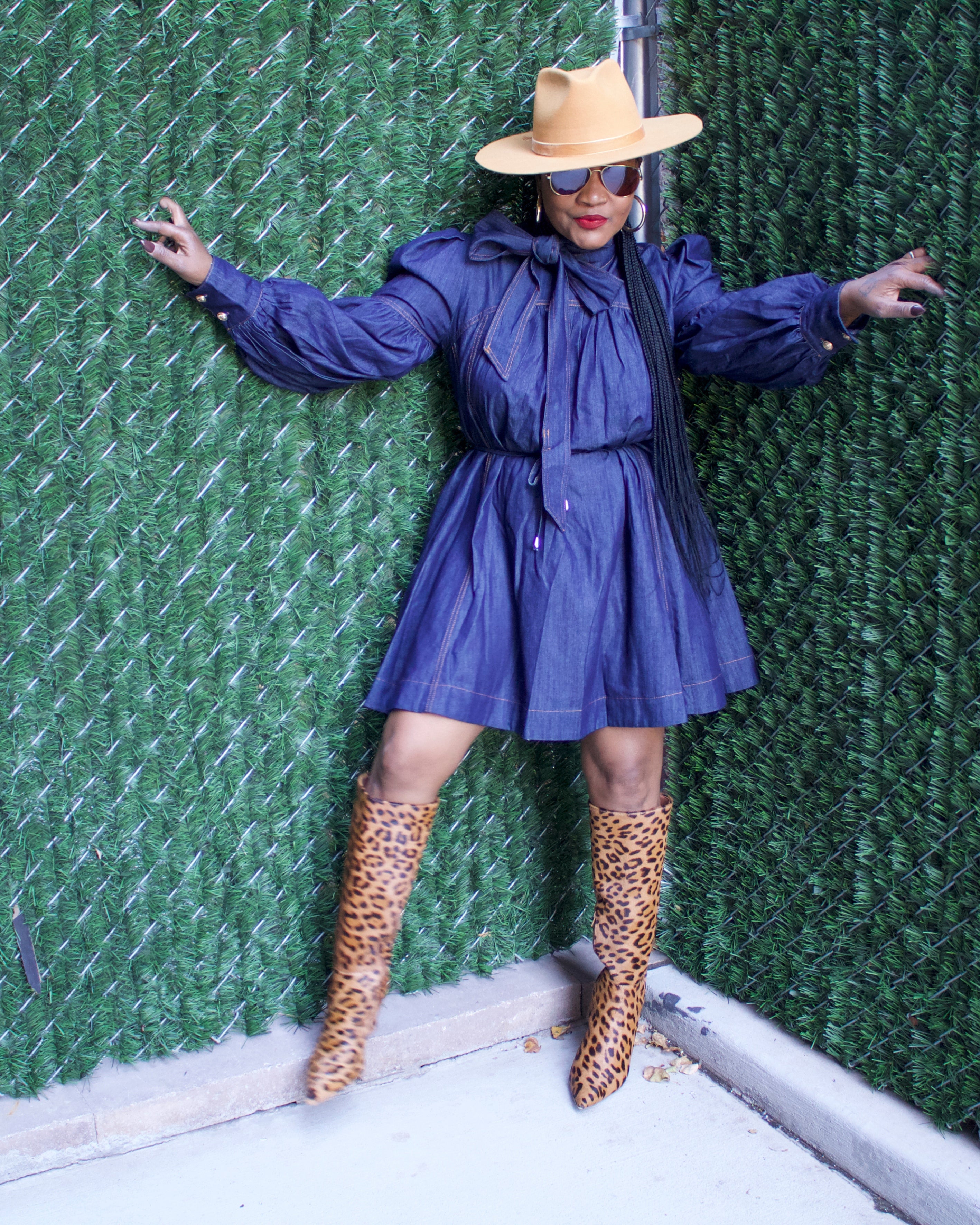 Soft denim meets high drama in this statement piece. Exaggerated sleeves and a flirty pussy bow create an effortlessly bold silhouette, while delicate gold details add refined edge. The baby-doll cut balances sweetness with attitude—wear it solo for maximum impact or layer over leather for an undeniable presence. True to size. Model wears a medium.